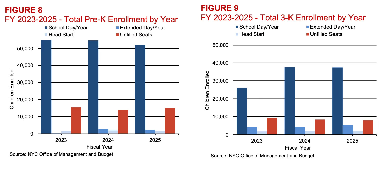 Last year, Pre-K enrolled 56,184 children, the fewest since 2015, and more than 13,000 below the program’s peak in 2017. Over 15,000 seats, 27% of total capacity, sat empty. Meanwhile, 15% of 3-K seats went unfilled.