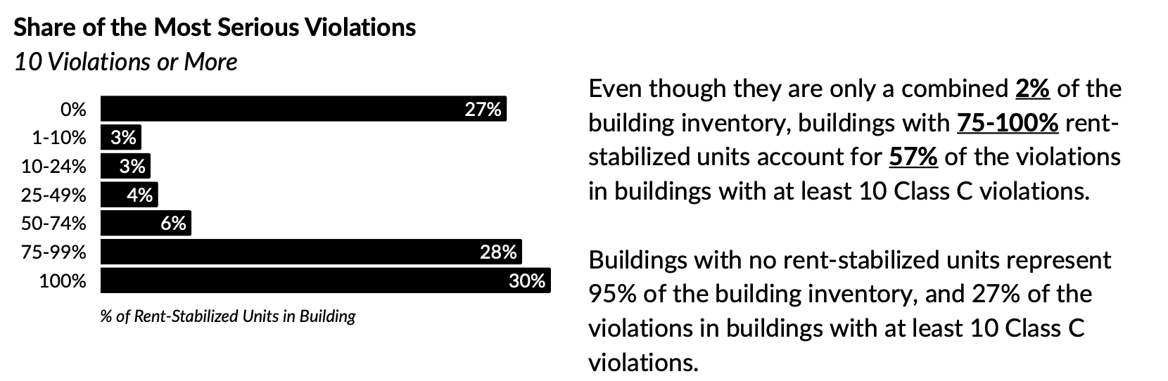 The landlord group REBNY took a closer look at the rental market and unsurprisingly found that most landlords were not ‘bad’ landlords by their definition. Violations, evictions and complaints were concentrated in a small percentage of buildings, and the more rent stabilized units there were in a building, the more issues the building had.