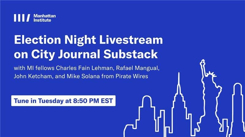 We’re going live on election night! Join City Journal contributors Charles Fain Lehman, Rafael Mangual, and John Ketcham to break down the biggest New York City mayoral election in decades.
